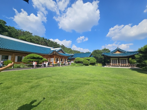 연못과 정자, 푸른 산이 있는 아름다운 풍경