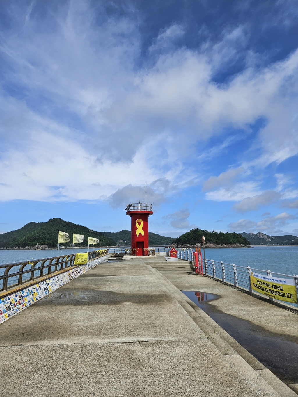 섬과 바다를 배경으로 한 등대가 있는 부두,